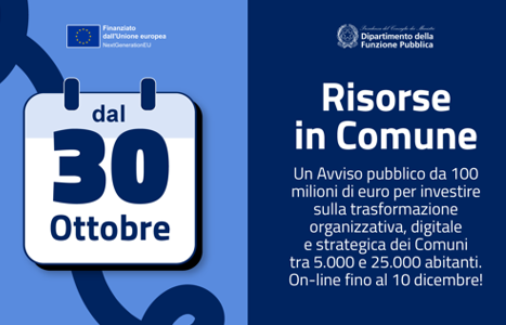 A partire dal 30 ottobre e fino al 10 dicembre 2025, tutti i Comuni italiani con popolazione compresa tra 5.000 e 25.000 abitanti potranno aderire al nuovo Avviso pubblico “Risorse in Comune”, promosso dal Dipartimento della funzione pubblica.